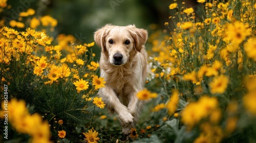 Cute golden retriever playing in a field of yellow daisies during golden hour. Heartwarming pet lifestyle photo with a shallow depth of field