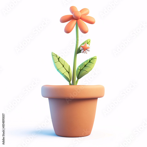 Cute green plants blooming in flower pot 3D illustration, gardening home concept element