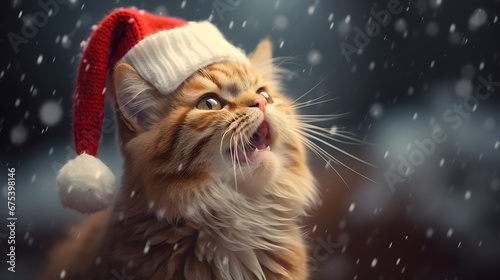 Cute grey cat wearing Santa Christmas red hat in snow falling sky winter scene