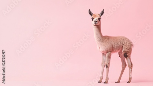 guanaco, llama, mammal, animal, wildlife, portrait, standing, pink, background, isolated, young, studio, shot, single, alone, fur, fluffy, ungulate, artiodactyla, south, america, peruvian, adorable, light, blithe, funny, domesticated, farm animal, herbivore, fauna, nature, wild, andes, andean, baby, calf, cute, curious, delicate, fawn, graceful, pale, sweet