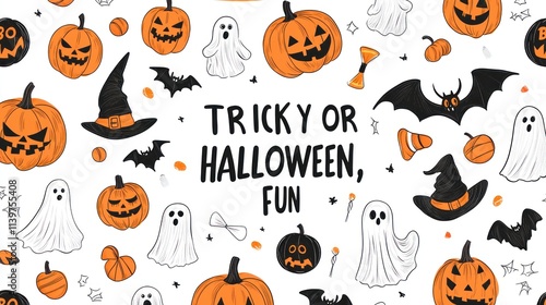 halloween, pattern, pumpkin, ghost, bat, sorcerer, hat, trick, or, treat, fun, skittish, fall, autumn, holiday, celebration, design, background, graphic, illustration, cartoon, drawing, children, children, seamless, print, vector, cute, whimsical, decoration, party, festive, image, pumpkin, ghost