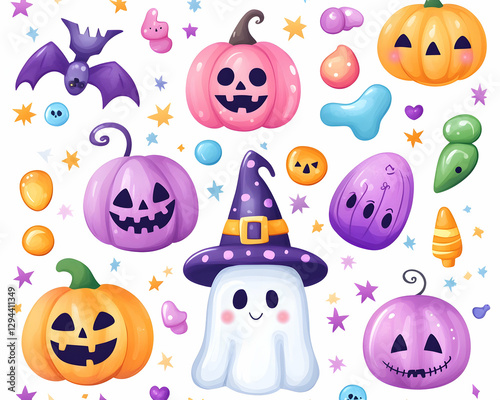 halloween, pumpkin, ghost, candy, cute, skittish, pastel, illustration, bat, sorcerer, hat, star, colourful, design, digital, art, vector, clip art, seamless, pattern, background, october, holiday, festive, fun, whimsical, adorable, cartoon, character, sweet, treat, element, graphic, image, printable, download, autumn, fall, children, party, decoration