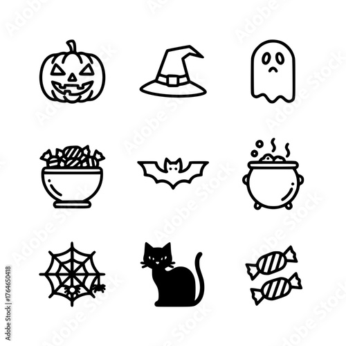 halloween, doodle, icon, pumpkin, ghost, candy, black cat, bat, cauldron, trick or treat, skittish, october, cute, cartoon, outline, drawing, celebration, autumn, holiday, scarey, party, children, magic, symbol, design, set, vector, isolated, eerie, fun, creepy, simple, illustration