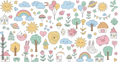 Cute hand drawn elements featuring sun clouds rainbows animals houses balloons and flowers