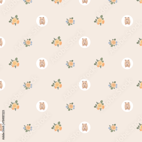 Cute hand drawn style hamster and rose background. Warm, refreshing and quiet colors. Hamster eating pumpkin seeds seamless pattern