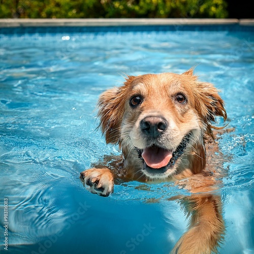 dog, puppy, swimming, pool, water, summer, happy, cute, retriever, pet, gold, animal, golden retriever, canino, labrador, white, portrait, breed, domestic, sitting, friends, brown, purebred, isolated, mammal, fur, tongue, adorable, pedigree, doggy