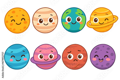 planet, cartoon, space, cute, solar, system, character, set, vector, illustration, icon, collection, face, astronomy, children, celestial, galaxy, earth, saturn, mars, jupiter, funny, happy, sad, expression, emotion, smile, colourful, sticker, isolated, graphic, design, science, children, baby, childcare center, educational, cosmic, universe, star, astrology