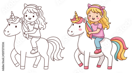 Cute Kawaii Unicorn and Little Girl Line Art Vector Illustration Black and White with Coloring Sample. Bold and Easy Animals Coloring Pages for Adults and Kids. Kids apparel print design
