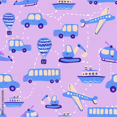 Cute kids vector seamless pattern with hand drawn airplanes, helicopters, cars, buses, ships. Various transport for printing on textiles and paper. Illustration for boys about travel and movement