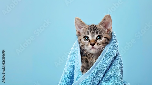 Cute kitten wrapped in a blue towel after a bath, set against a blue background, highlighting grooming salon services and pet treatment goods