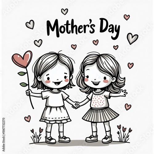 Cute Line Art Girls Holding Hands for Mother's Day