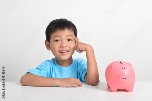 Cute little asian child holding piggy bank isolated on white background. Saving money for kids concept. Learn about saving. Money, finance and insurance concept