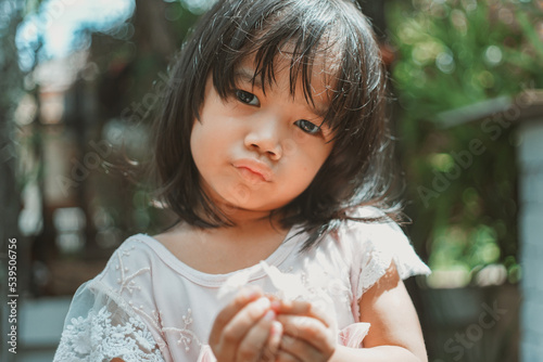 cute little asian girl holding a white bouquet. Child planting spring flowers.