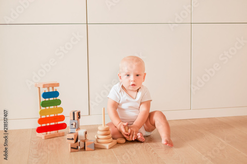 Cute little baby boy playing with stacking rings