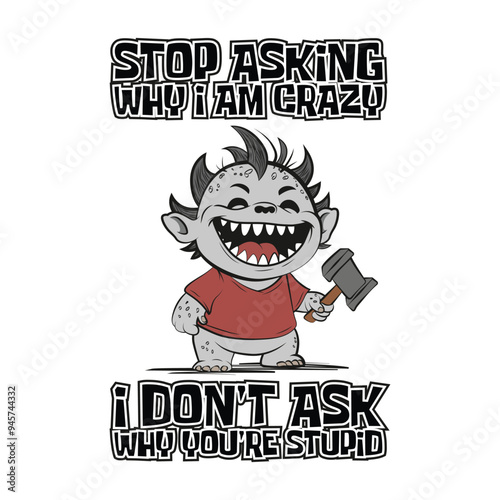 Cute little baby monster with a hammer in hand and a funny quote Stop asking why I am crazy, I don't ask why you're stupid. Vector illustration for tshirt, website, clip art and print on demand merch.