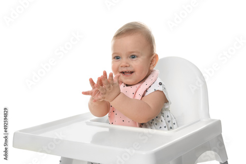 Cute little baby wearing bib in highchair on white background