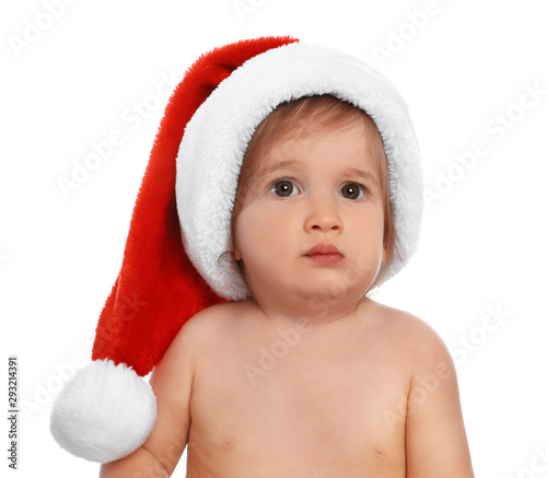 Cute little baby wearing Santa hat on white background. Christmas celebration
