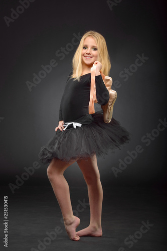 Cute little ballerina with long hair in a black tutu and pointe posing on a black background