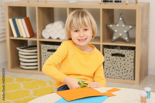 Cute little boy cutting orange paper at desk in room. Home workplace