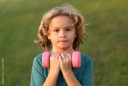 Cute little boy doing exercises with dumbbells. Portrait of sporty child with dumbbells. Happy child boy exercising. Healthy activities kids lifestyle.