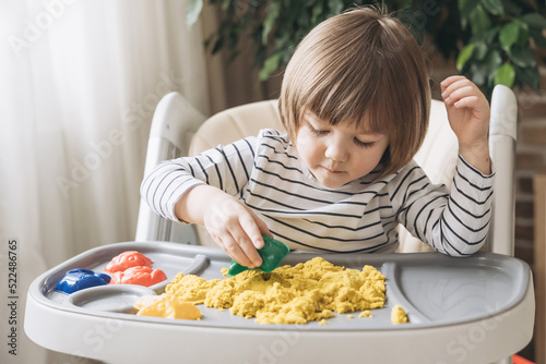 Cute little boy playing with kinetic sand. Development of fine motor skills. Early sensory education. Activities Montessori. Sensory plays at home.