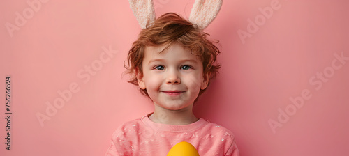Cute little boy with bunny ears holding Easter egg on the pink background