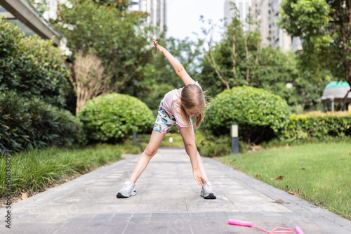 Cute little caucasian Girl with blonde hair Stretching outdoor on backyard Before Running