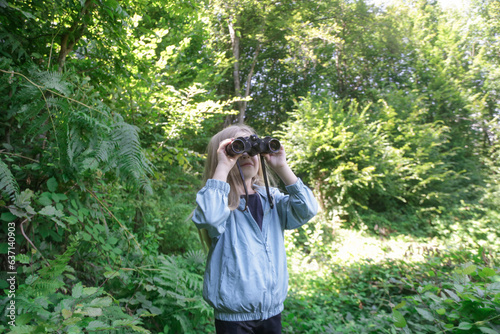 Cute little girl exploring nature looking through binoculars. Child playing outdoors. Kids travel, adventure and bird watching concept.