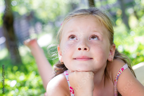 Cute little girl laying in the grass on a sunny summer day