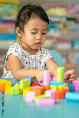Cute little girl playing with multicolor wooden building blocks on blue table.