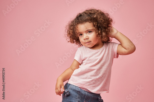 girl, grace, childhood, charming, feminine, gentle, tender, innocent, idylli, harmony, toddler, soft, children, adorable, cute, floor, sweet, female, children, stylish, pleasure, contemplate, style, modern, posing, enjoy, trendy, dreamy, curly hair, brown hair, little, studio shot, copy space, looking away, emotionless, gaze, pose, model, fashion