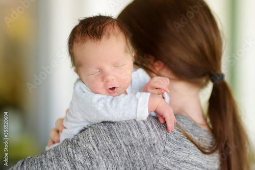 Cute little newborn baby boy in his mothers arms. Portrait of tiny new baby at home. Adorable son being held by his mommy.