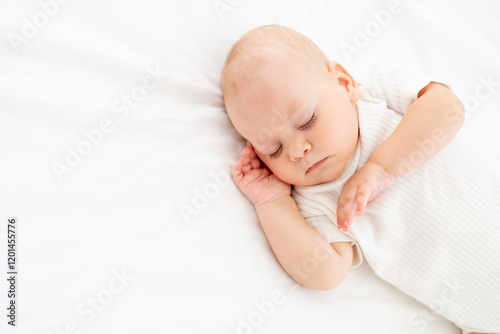 cute little newborn baby sleeps with his hand folded under his cheek, sweet healthy baby sleep in a white crib, a place for text