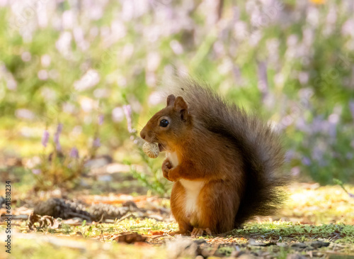 Cute little scottish red squirrel in the woodland with a monkey nut