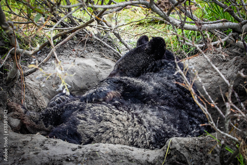 Cute looking black bear getting ready for hibernate sleeping