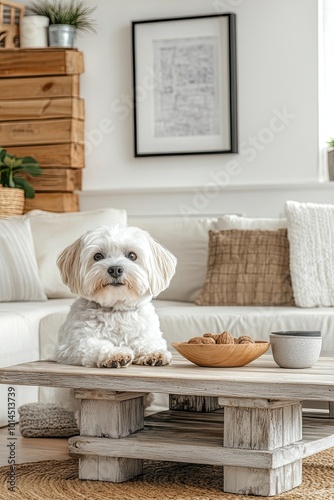 Cute Maltese dog and wooden table in a stylish living room.