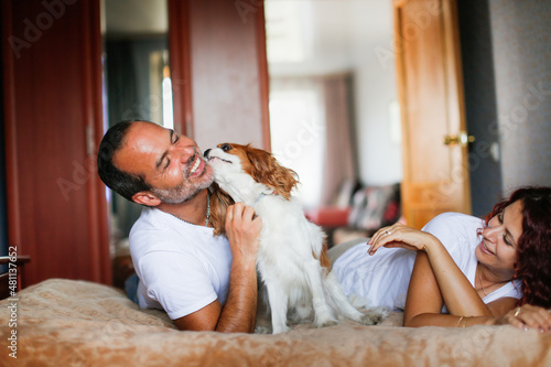 Cute middle aged european couple with a cavalier king charles spaniel dog in the bedroom on the bed. Man and woman with pet dog cozy lifestyle in real inter