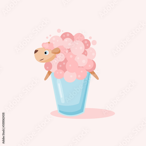 Cute milkshake with foam in the form of a funny pink sheep. Vector illustration in cartoon style. Picture for stickers, postcards, notebooks, textiles, wallpapers, screensavers
