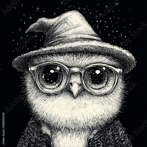 cute, owl, magician, hat, magical, night, sky, star, goggles, animal, portrait, whimsical, fantasy, nature, cosy, illustration, character, charme, wonder, dreamy, mystical, art, creativity, enchanting, fun, imaginative, nocturnal, adorable, forest, adventure, light, shadow, colours, artwork, small, delightful, serene