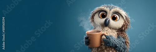 Cute owl with big eyes is holding a hot coffee mug in its beak, against a blue background.