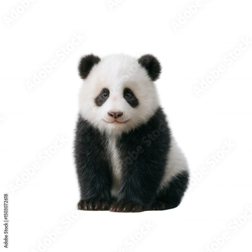 Cute panda cub sitting, showcasing its black and white fur against a white isolated background, perfect for wildlife and animal themes.