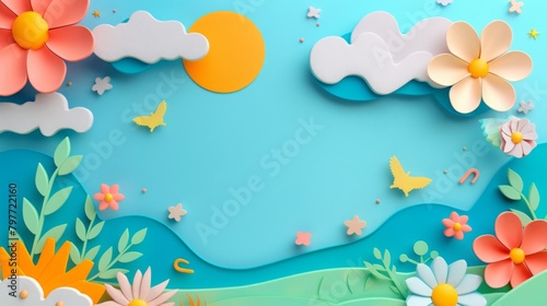 Cute Paper Cut Spring Scene with Flowers and Butterflies