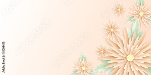 Cute pastel vector paper cut background with flowers in peach color and green leaves. Floral template design with layered elements for greeting card or wedding invitation. Aster illustration