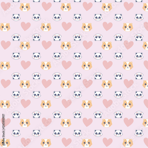 Cute Pattern with Guinea Pig and Panda Faces, Pink Hearts