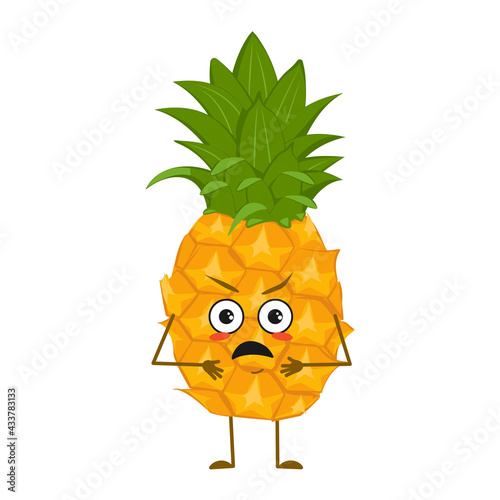 Cute pineapple characters with angry emotions, face, arms and legs. The funny or grumpy food hero, fruit