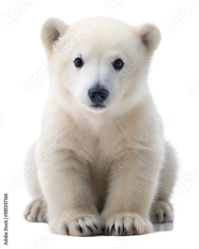 Cute polar bear cub with fluffy white fur and inquisitive eyes on a transparent background