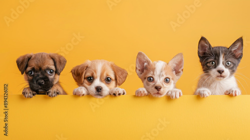 Cute Puppies and Kitten Peeking Over Yellow Background