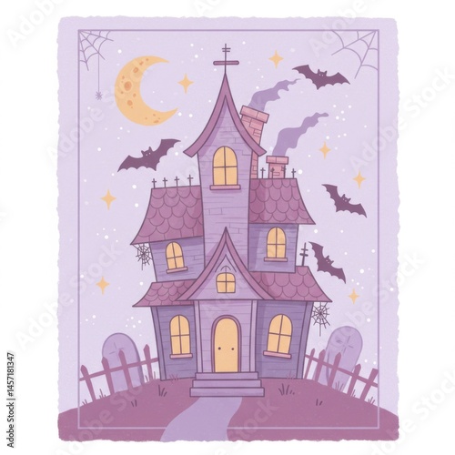 Cute Purple Haunted House Halloween Night Illustration