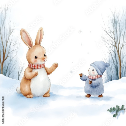 rabbit, animal, snow, forest, winter, play, cute, tree, snowflake, clothing, foulard, hat, joyful, illustration, nature, outdoors, cold, fun, friendship, cartoon, character, timberland, scene, landscape, white, blue, brown, fluffy, ear, paw, branch, sky, peaceful, serene, whimsical, gentle, playful, interaction, seasonal, cosy