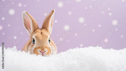 Cute rabbit peeks over snowy surface against soft purple background with falling snowflakes, creating whimsical winter scene